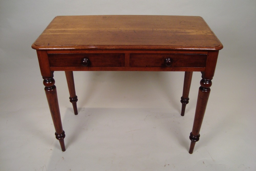 A lovely Victorian mahogany writing desk. This piece is in good condition with it's original polish. The table has turned legs and two drawers that run smoothly.