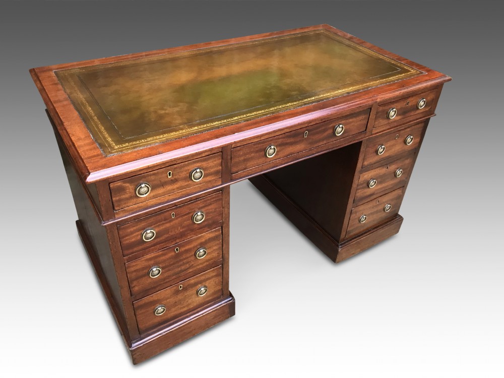 A very special mahogany twin pedestal desk in very good condition. A fine quality desk which has three drawers above three graduated drawers all with their locks and eschutions. The hand cut dove tail joint drawers have solid linings and fronts with brass plate handles. The special feature is the incredible and original hand dyed leather inlay which is in hide as oppose to skiver top, a sign of quality. The leather needs to be seen in person as the patina is truly outstanding.